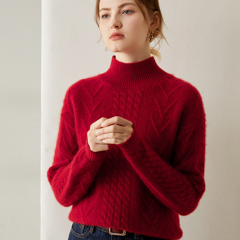 秋季和冬季增厚的羊絨毛衣毛衣婦女半烏龜衣領寬鬆的電纜固體羊絨套管中領底毛衣
