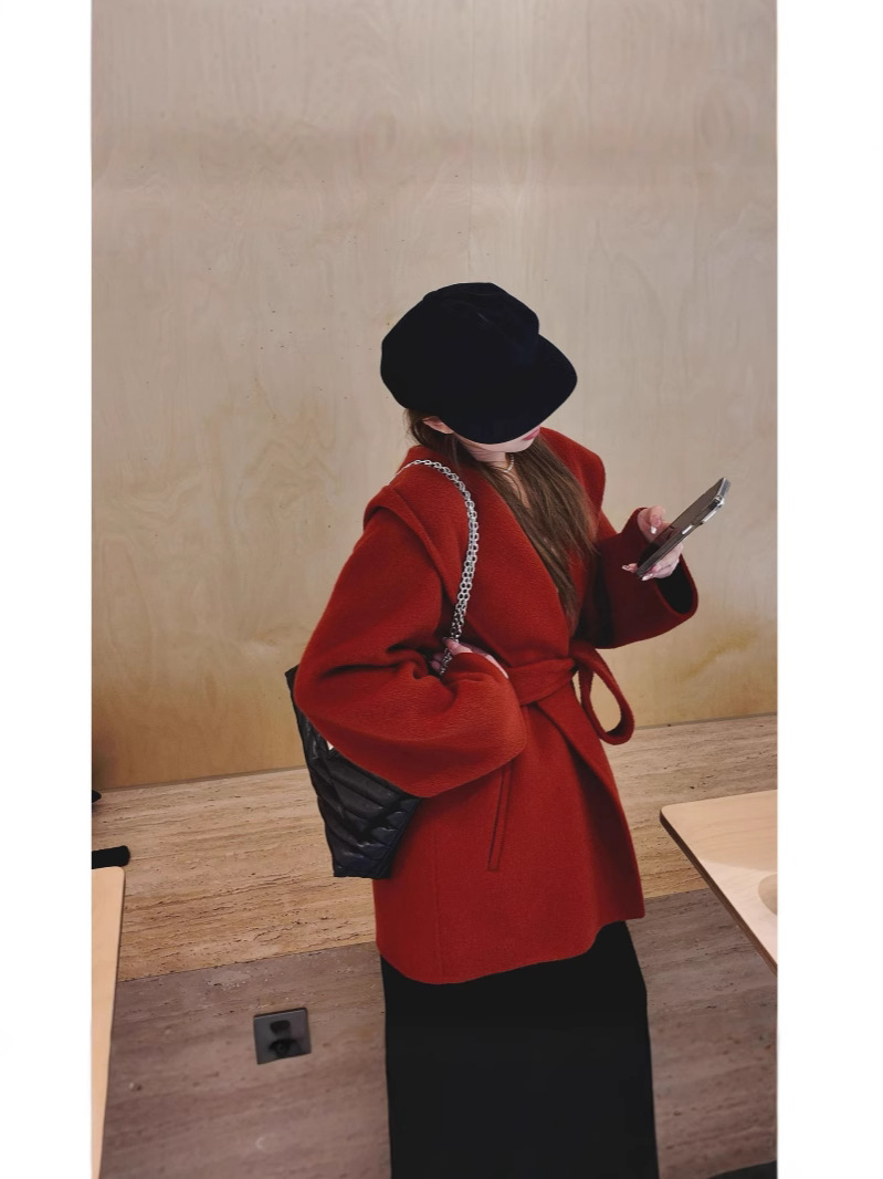 韓國風格的連帽羊絨外套,高端女性小雙面羊毛外套