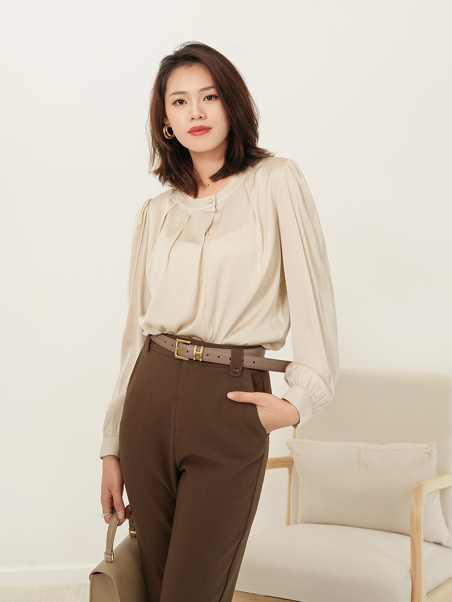 女性桑silk襯衫上衣秋季新氣質通勤泡芙長袖圓脖子套頭衫襯衫